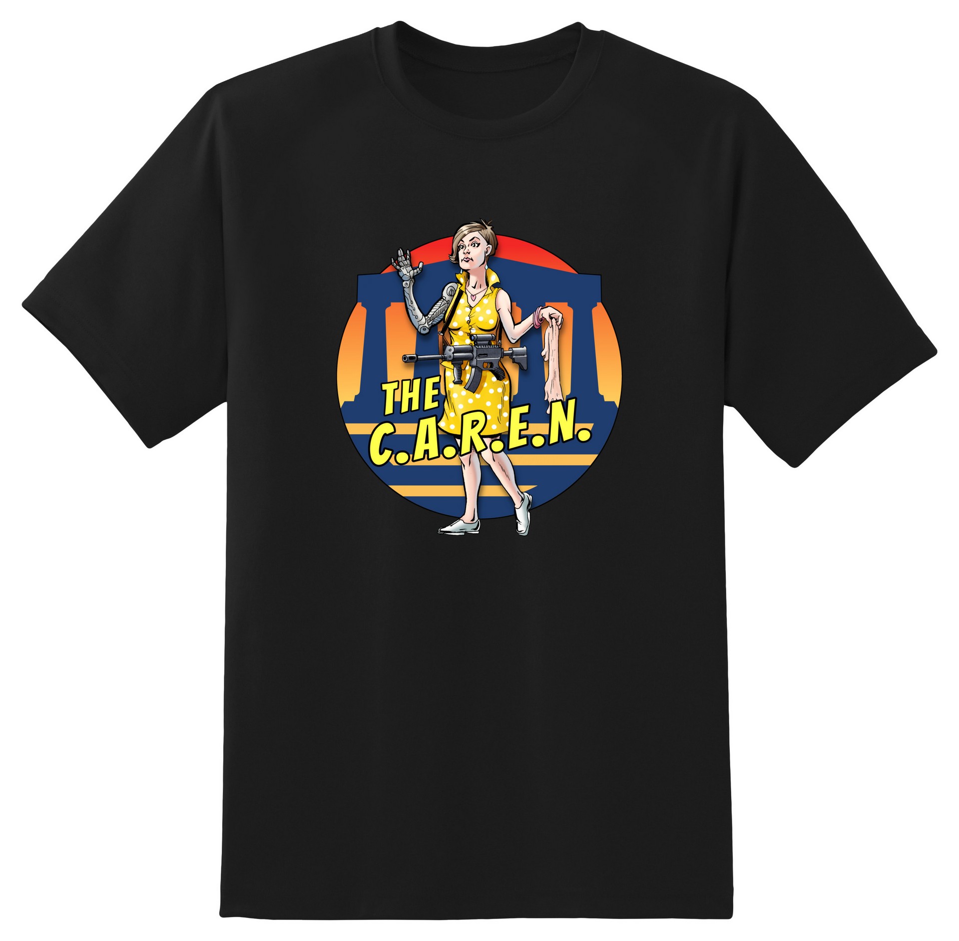 ...embedded at various points of their bodies, few details escape the C.A.R.E.N’s notice. This cyborg is designed to diplomatically, but firmly, engage potential suspicious persons and trespassers in order to dissuade unlawful entry into protected Alliance areas. In the event of escalation, she transmits a radio signal to jam all cell phone use within a six-hundred-yard radius. This prevents the dissemination of unwanted viral videos or other communications whereby she might be slurred as “a Caren.”